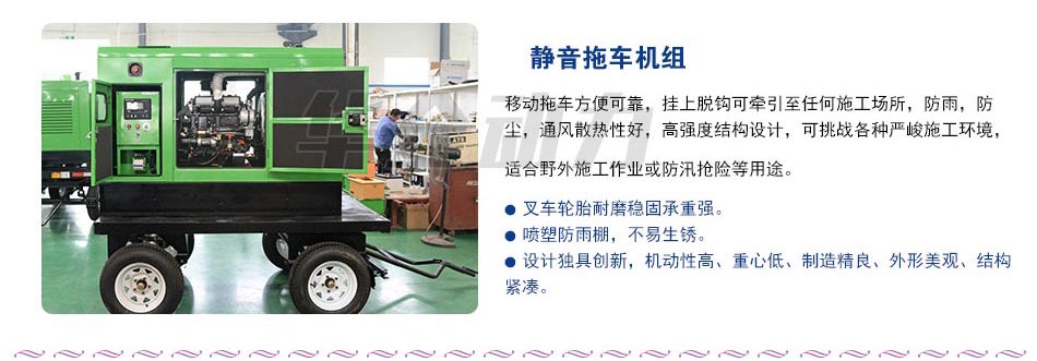 移動拖車方便可靠,掛上脫鉤可牽引至任何施工場所,防雨,防塵,通風散熱性好,高強度結構設計,可挑戰各種嚴峻施工環境,適合野外施工作業或防汛搶險等用途。