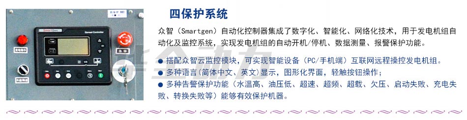 眾智(Smartgen)自動化控制器集成了數字化、智能化、網絡化技術,用于發電機組自動化及監控系統,實現發電機組的自動開機/停機、數據測量、報警保護功能。 ● 搭配眾智云監控模塊,可實現智能設備(PC/手機端)互聯網遠程操控發電機組。 ● 多種語言(簡體中 文、英文)顯示,圖形化界面,輕觸按鈕操作; ● 多種告警保護功能(水溫高、油壓低、超速、超頻、超載、欠壓、啟動失敗、充電失敗、轉換失敗等)能夠有效保護機器。